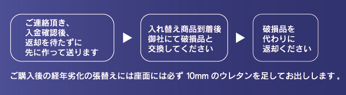 ご購入いただいたソファーを長く安心してご使用いただけるよう、充実したアフターサポート体制を整えております。クラブやスナックなど夜の店では、日々多くのお客様が利用されるため、座面のへたりや張地の傷みが気になることも少なくありません。そのような際もご安心ください。当社の製品はパーツごとのリニューアルが可能な構造になっており、部分修理から全面張替えまで柔軟に対応いたします。